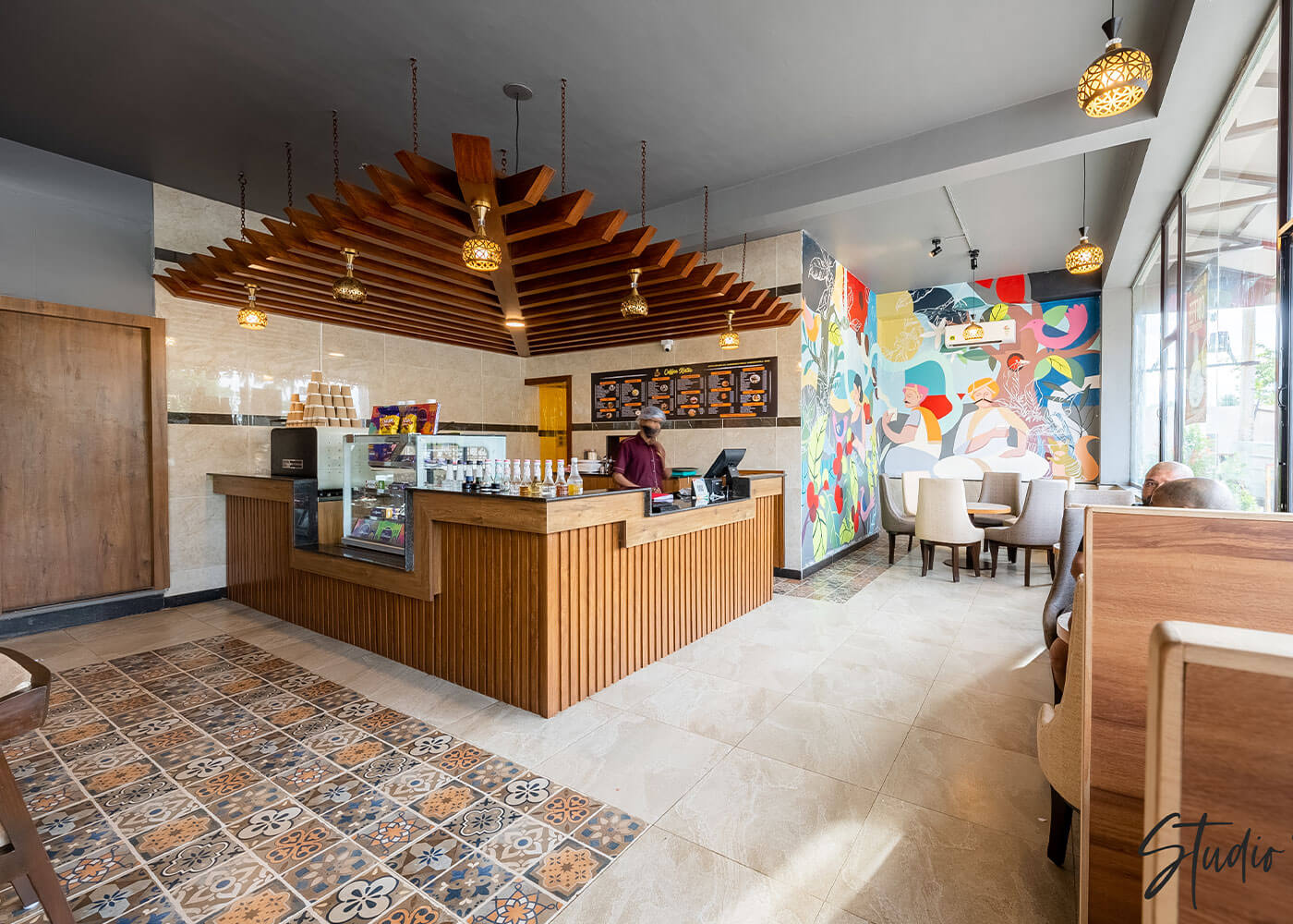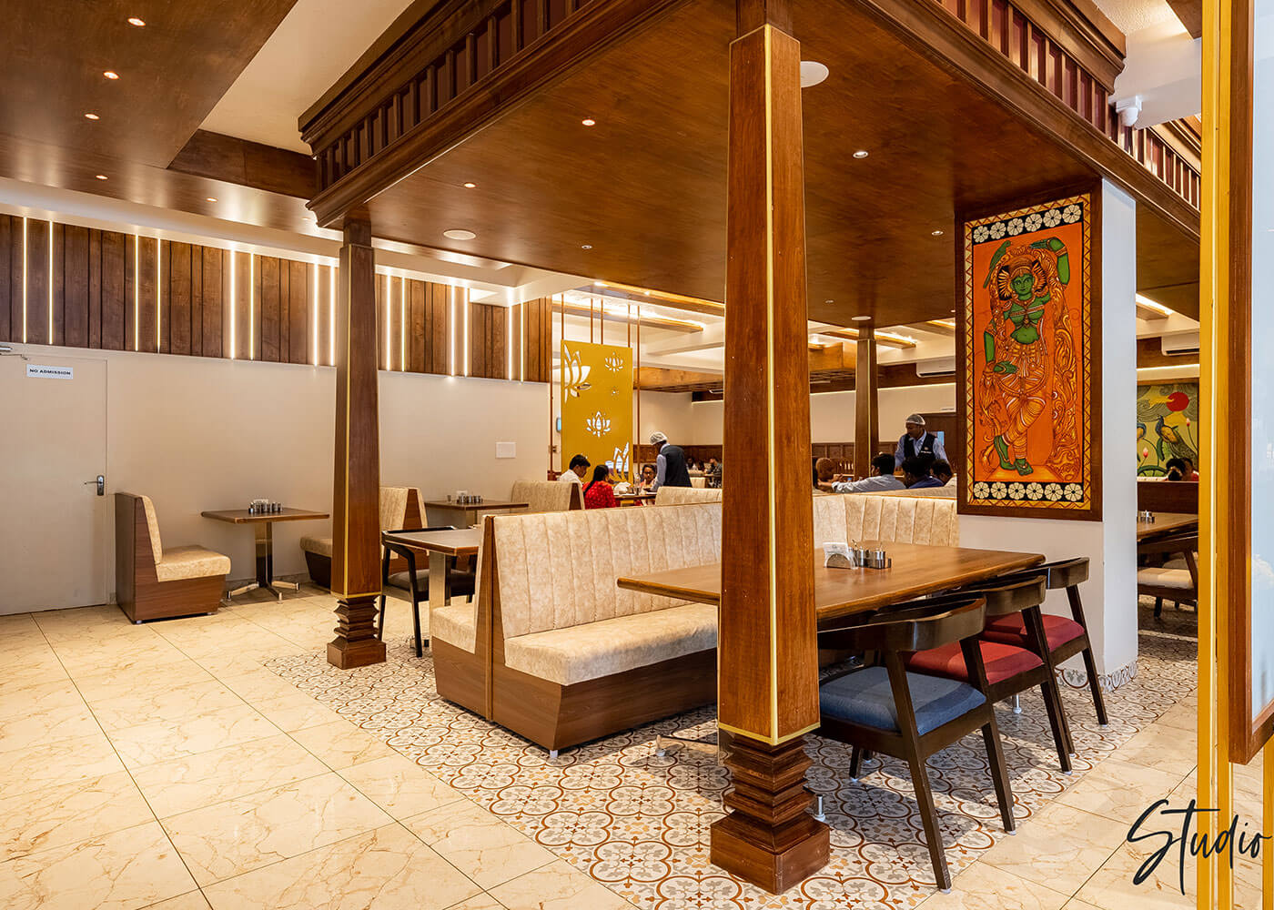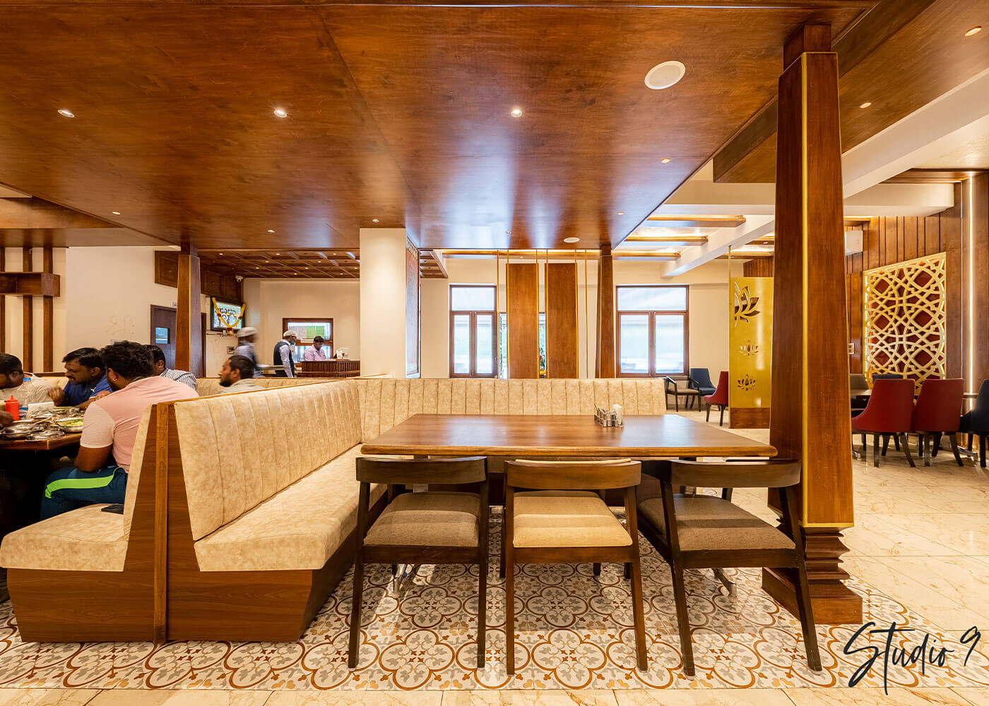 The expansive dining area continues this harmonious blend, featuring traditional tiling and an ornate wooden structure with banquette seating. Vibrant yellow accent walls with lotus motifs and golden lattice screens add cultural richness, ensuring a comfortable, engaging, and sophisticated dining ambiance.