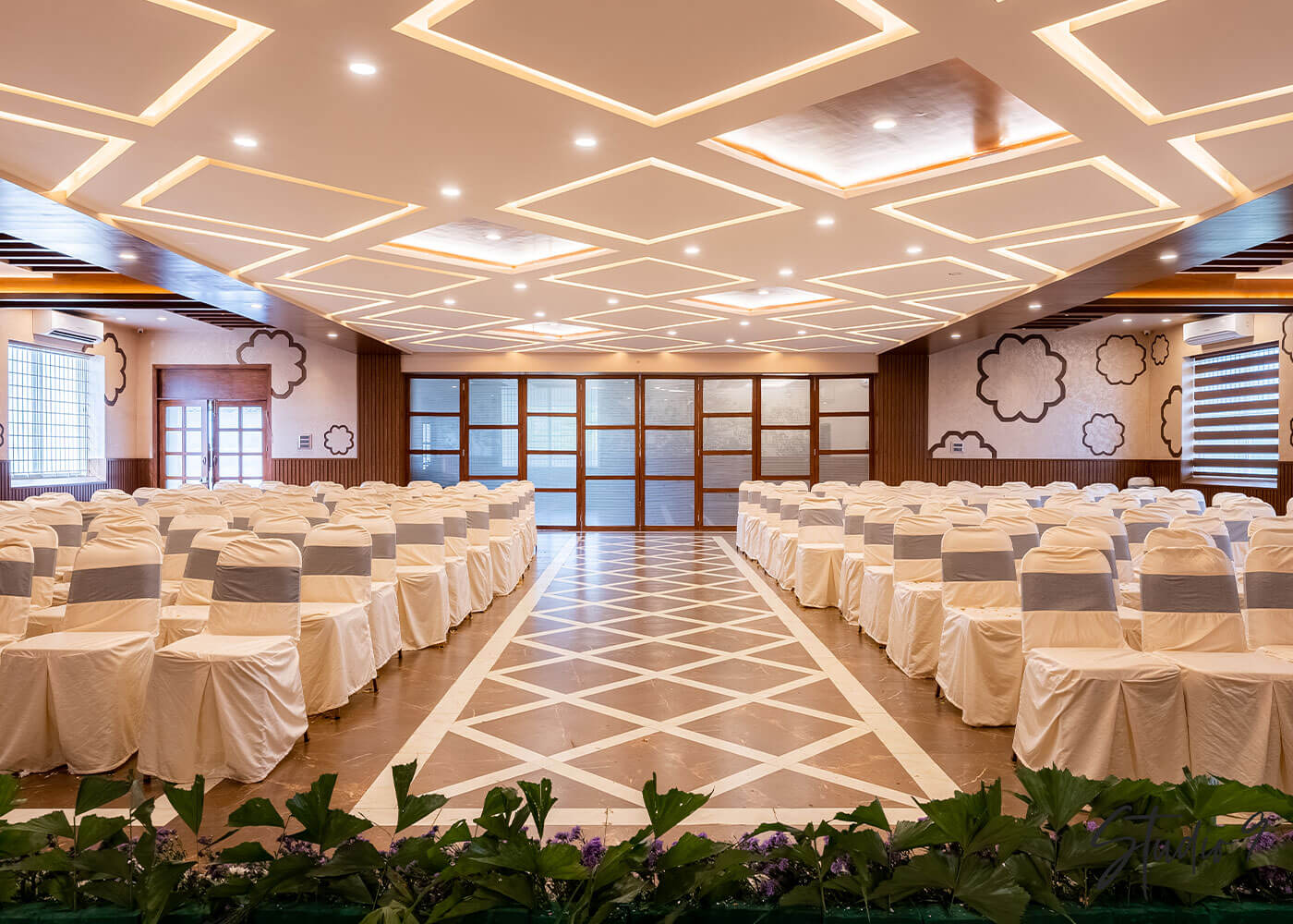 The ARADHYA GRAND , Kolar restaurant masterfully blends traditional Indian aesthetics with modern functionality. The reception area welcomes with warm tiled flooring, exposed wooden beams, and a blend of classic wood and modern white at the desk, bathed in natural light.