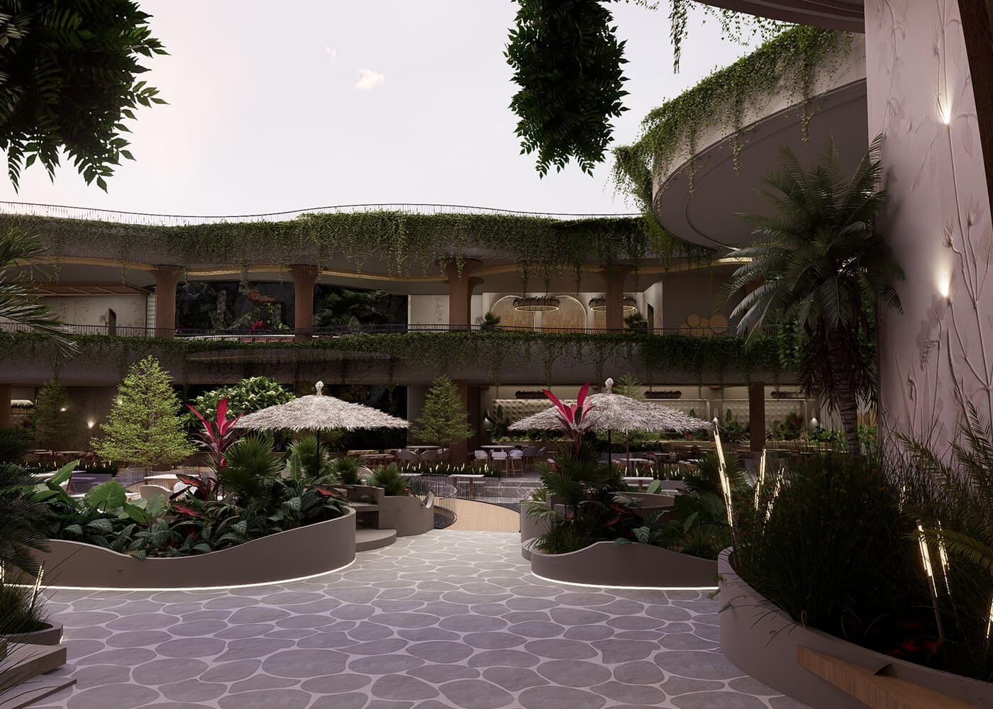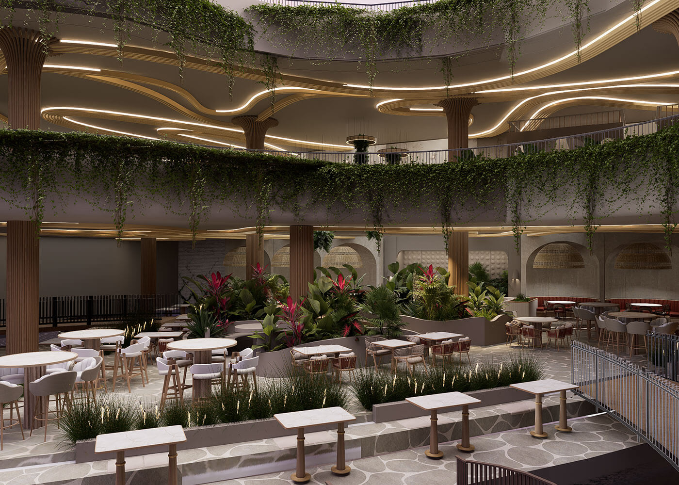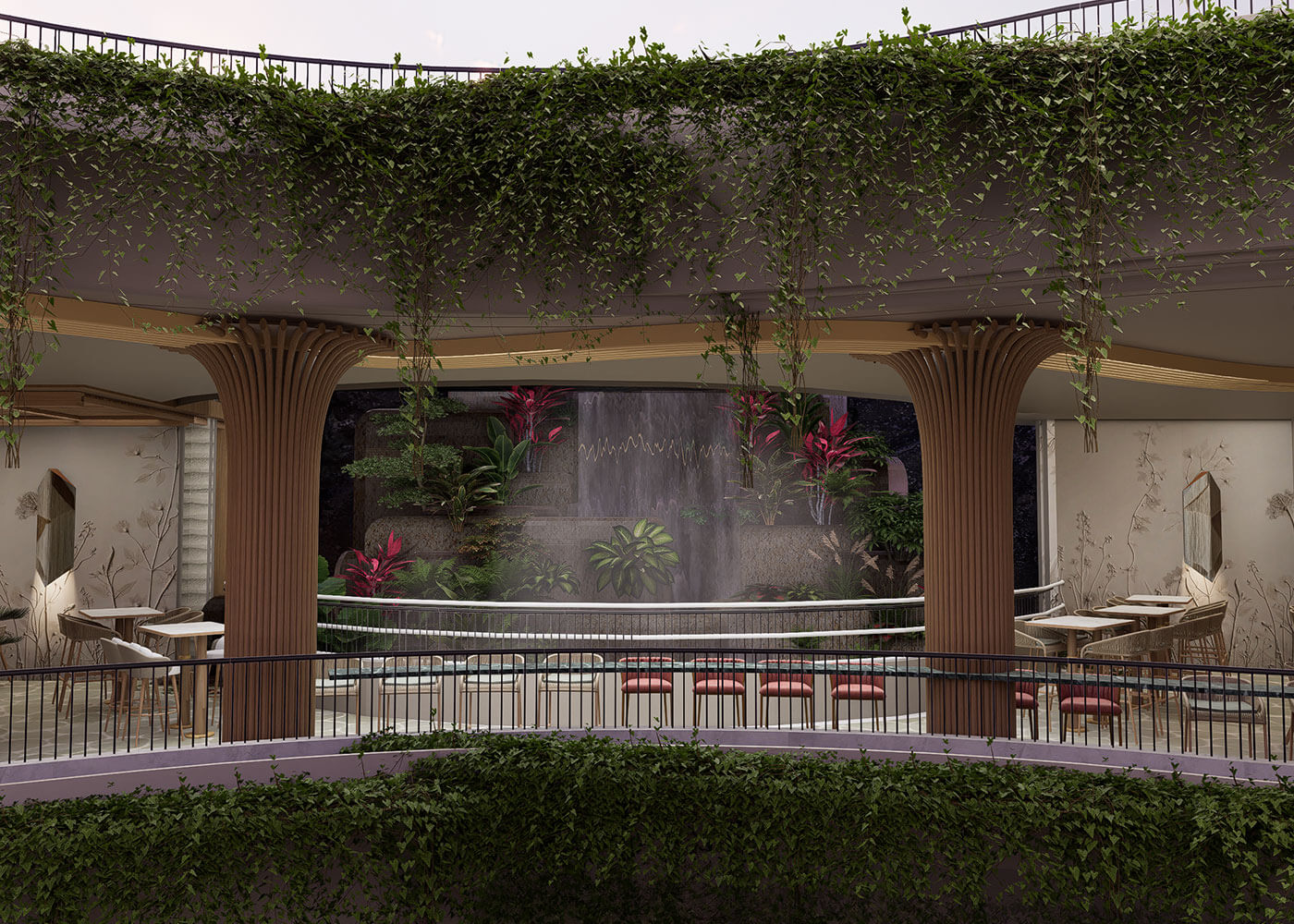 The space is further defined by a dramatic Tropical Forest Water Fountain, mimicking a natural waterfall with mist and exotic plants, serving as a refreshing focal point. This thoughtful blend of natural elements and varied seating creates a truly unique dining and leisure experience, promising a vibrant, calming escape into paradise.