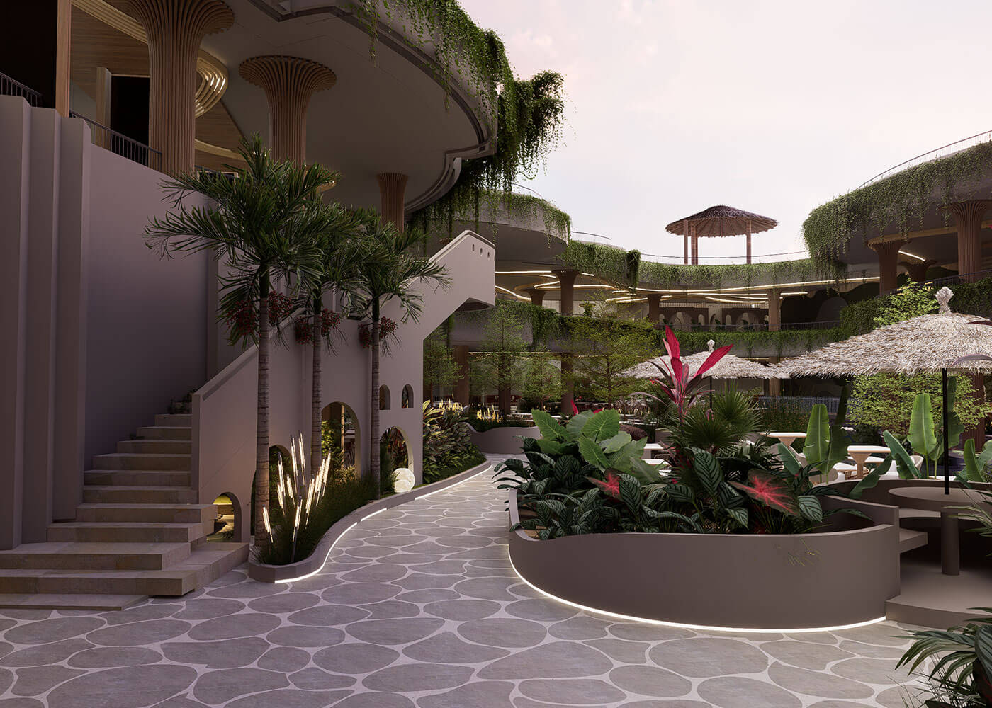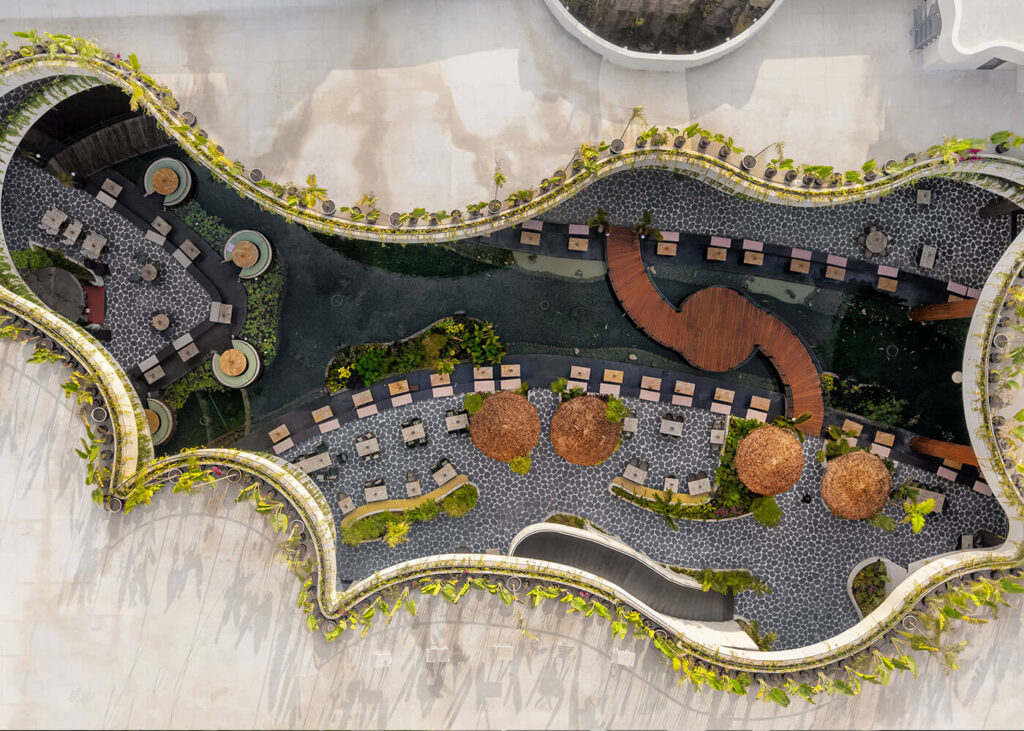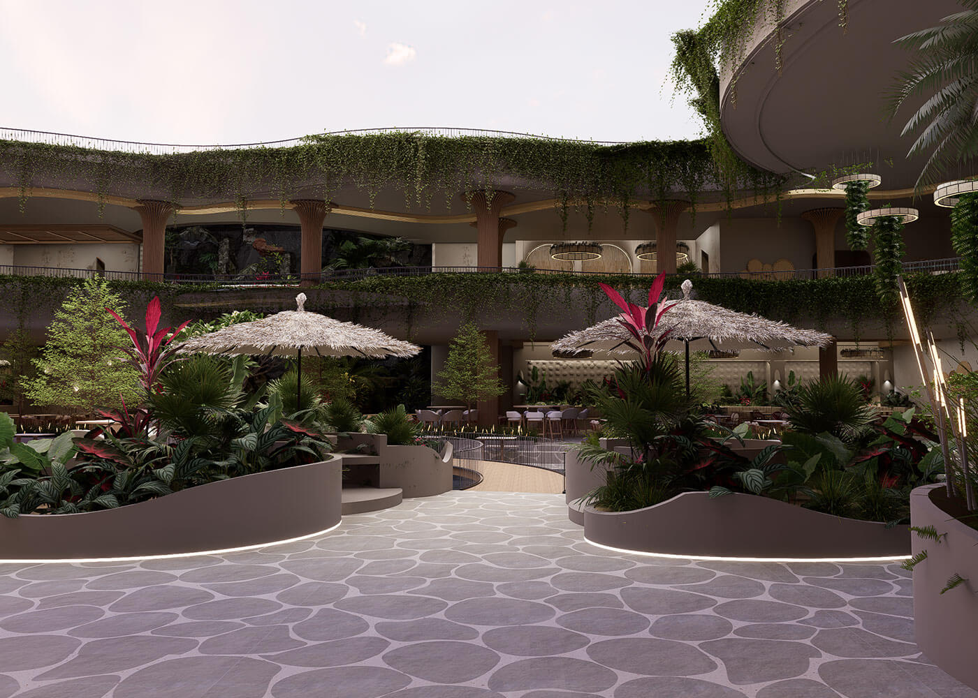 The space is further defined by a dramatic Tropical Forest Water Fountain, mimicking a natural waterfall with mist and exotic plants, serving as a refreshing focal point. This thoughtful blend of natural elements and varied seating creates a truly unique dining and leisure experience, promising a vibrant, calming escape into paradise.