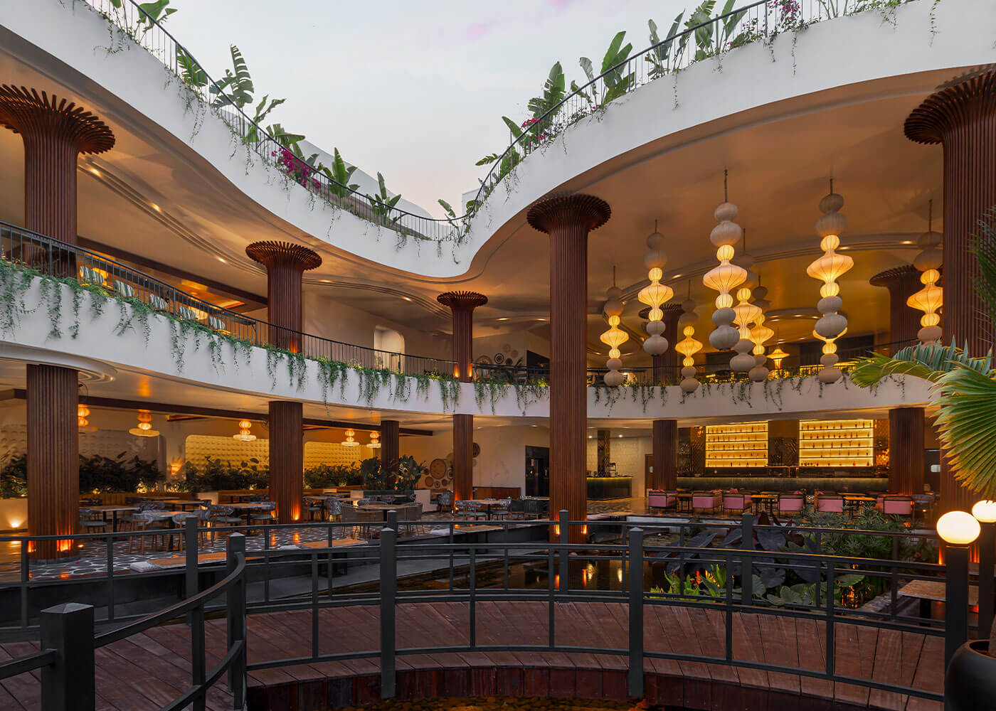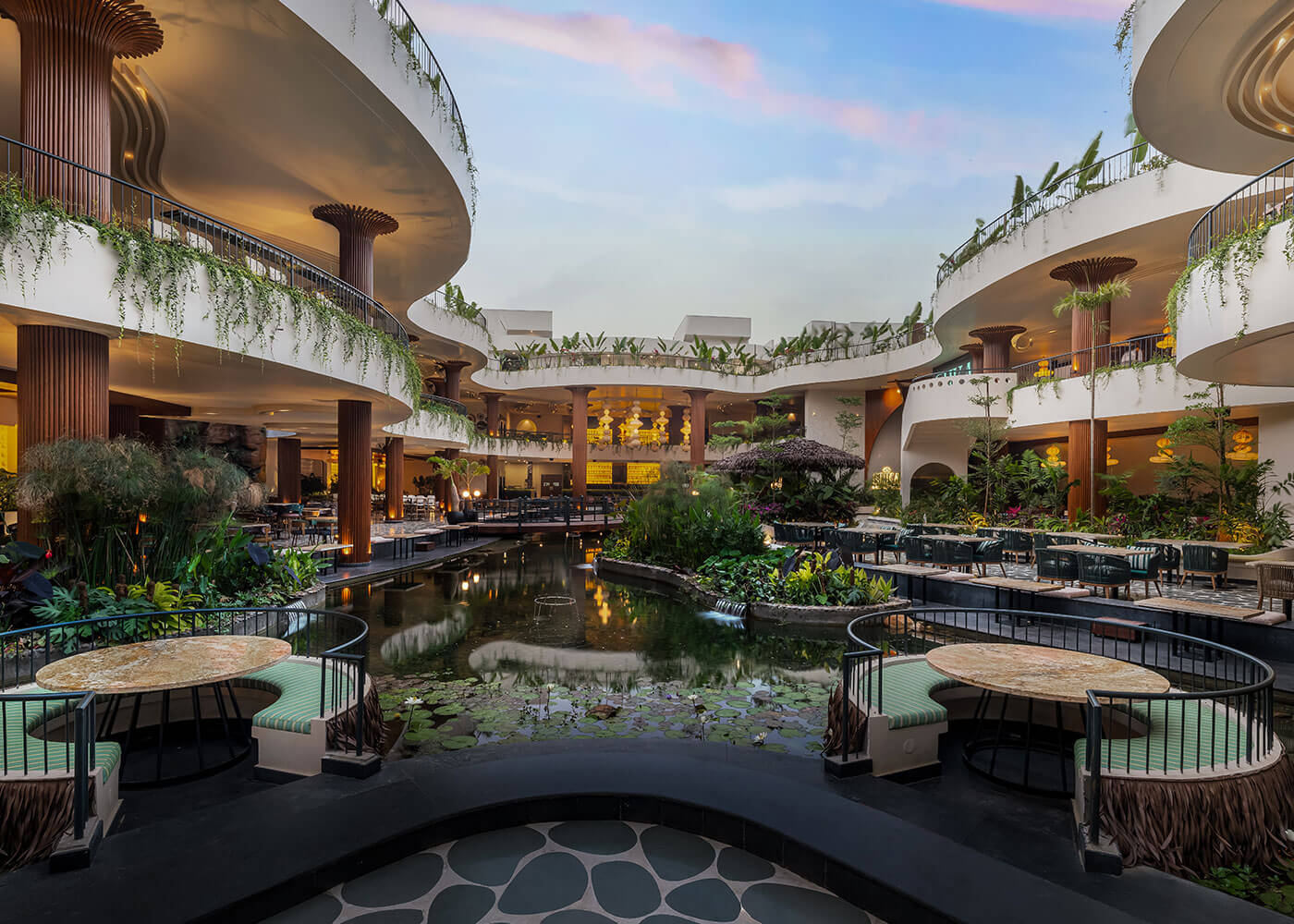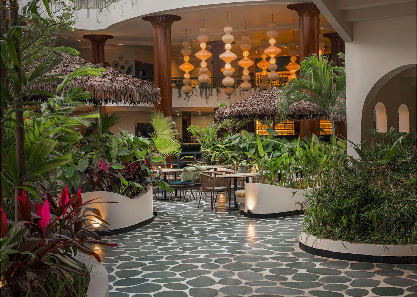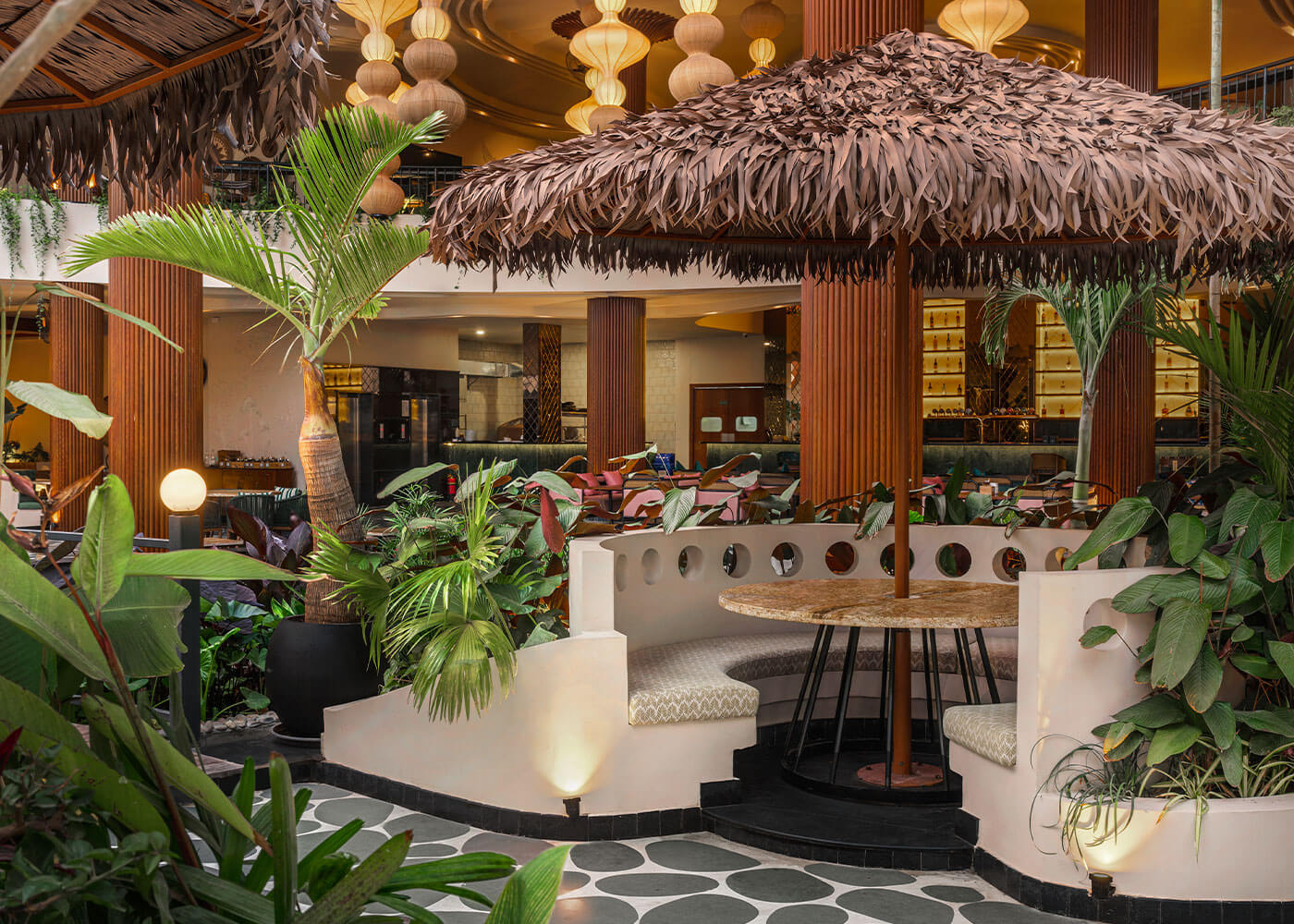 Atmosphere resto-pub crafts an immersive tropical environment, designed as a vibrant, serene oasis to transport guests from urban bustle. The experience begins with a tranquil Serene Courtyard featuring a waterbody and intimate Island Seating. Diverse seating zones, from lush, foliage-immersed areas and a comfortable Lush Lounge to private Corner Seating enveloped by greens, cater to various moods.