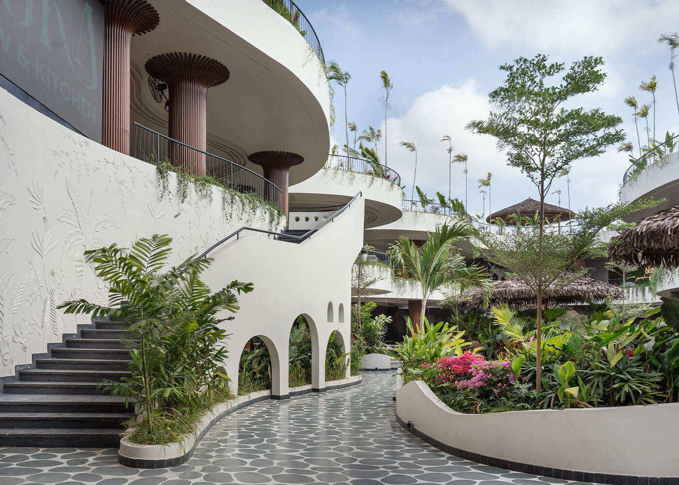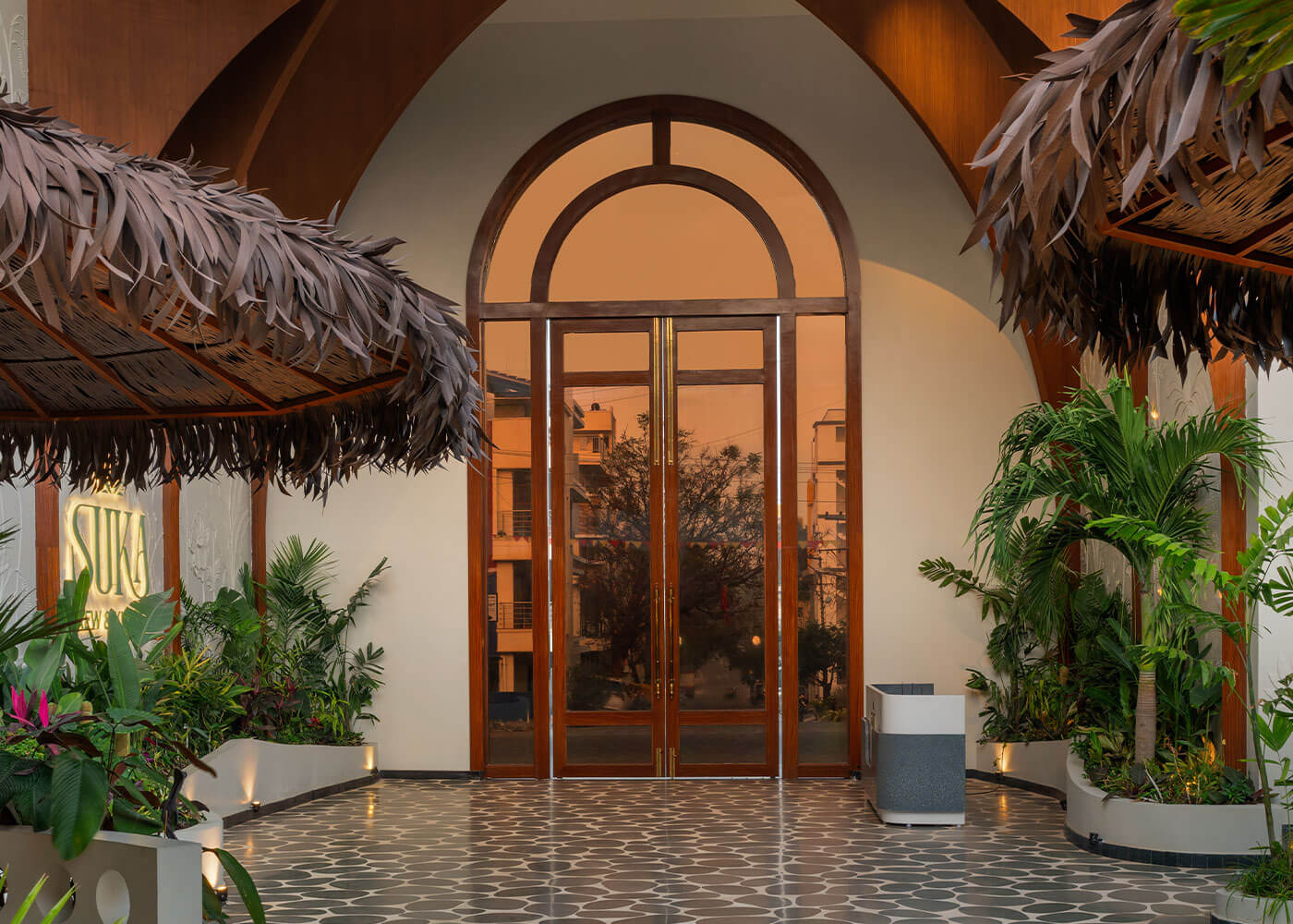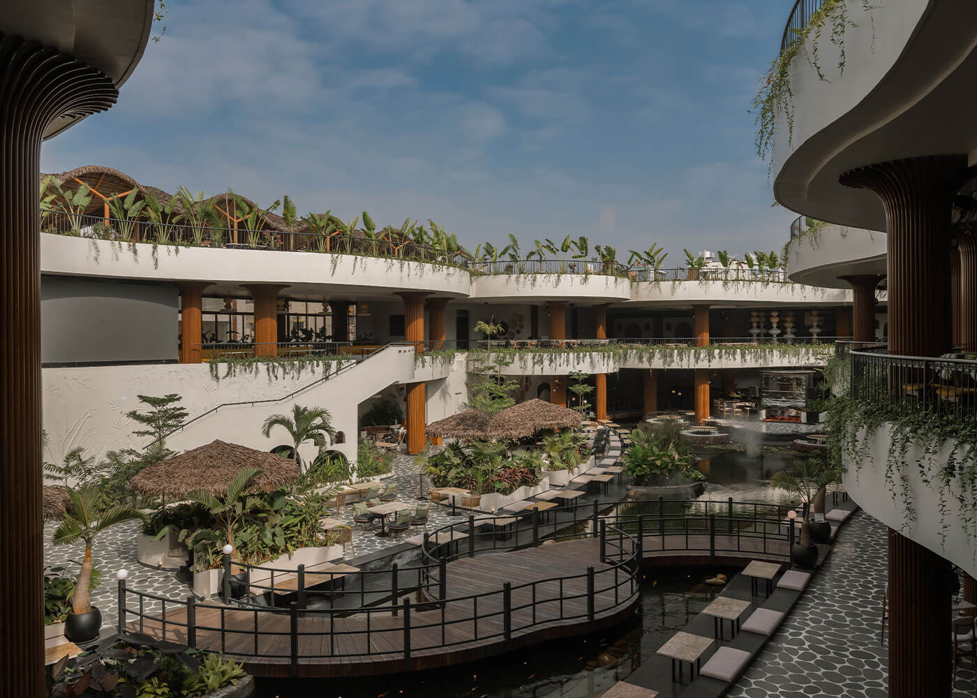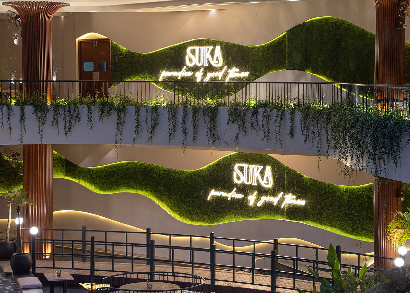 Atmosphere resto-pub crafts an immersive tropical environment, designed as a vibrant, serene oasis to transport guests from urban bustle. The experience begins with a tranquil Serene Courtyard featuring a waterbody and intimate Island Seating. Diverse seating zones, from lush, foliage-immersed areas and a comfortable Lush Lounge to private Corner Seating enveloped by greens, cater to various moods.