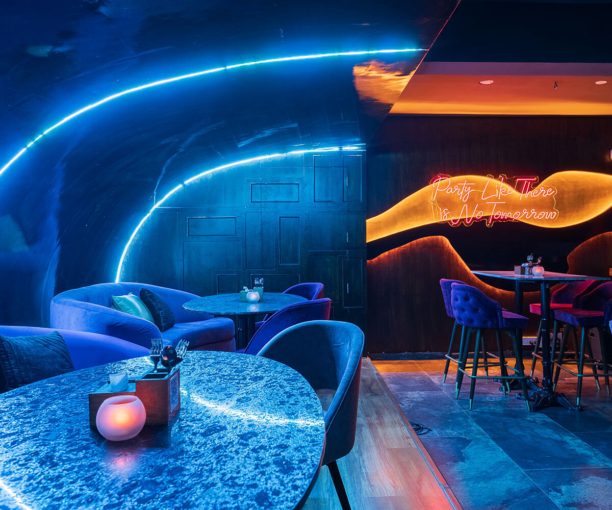 Strategic use of natural and artificial lighting enhances the ambiance, creating versatile moods that adapt throughout the day and night. The rooftop features a retractable roof system and integrated greenery, offering panoramic city views while maintaining comfort and flexibility for guests.