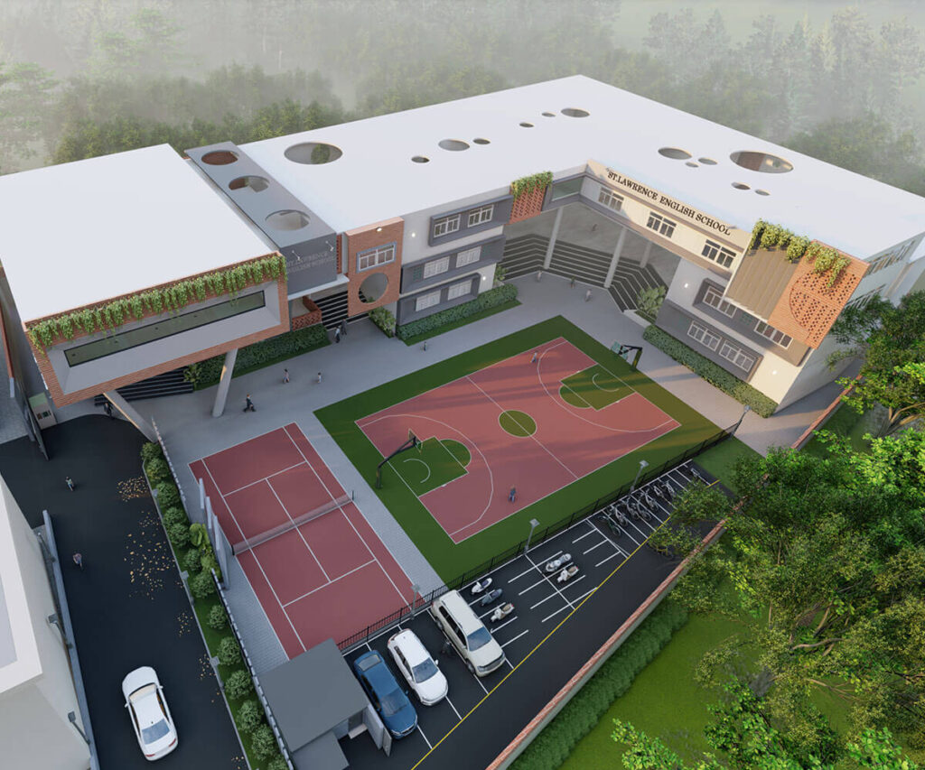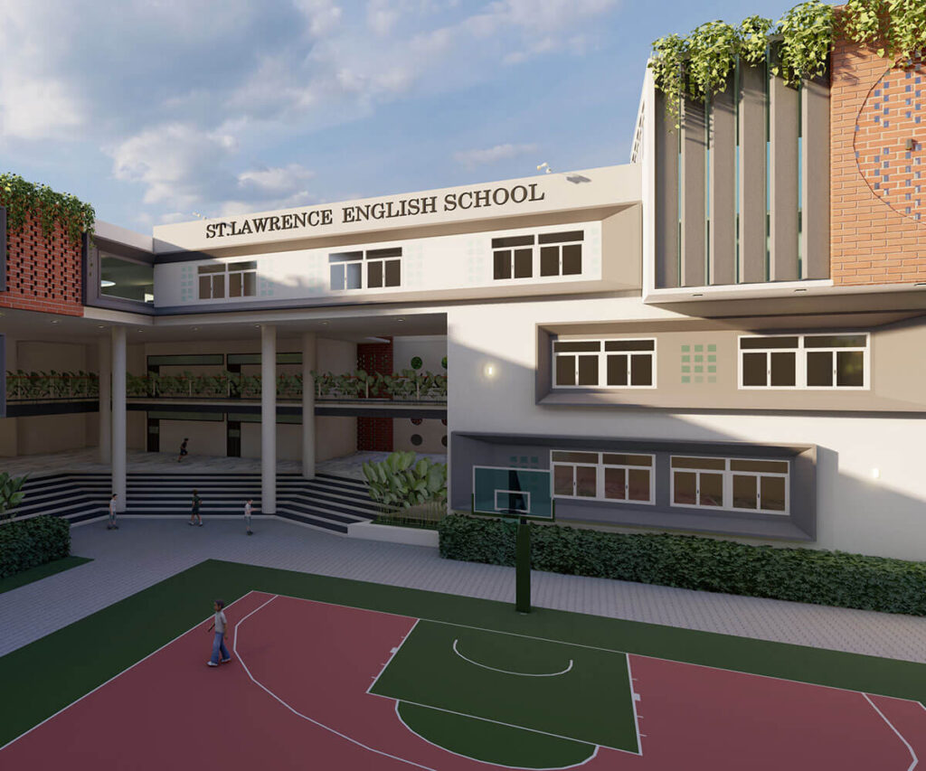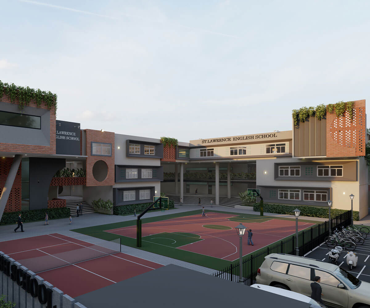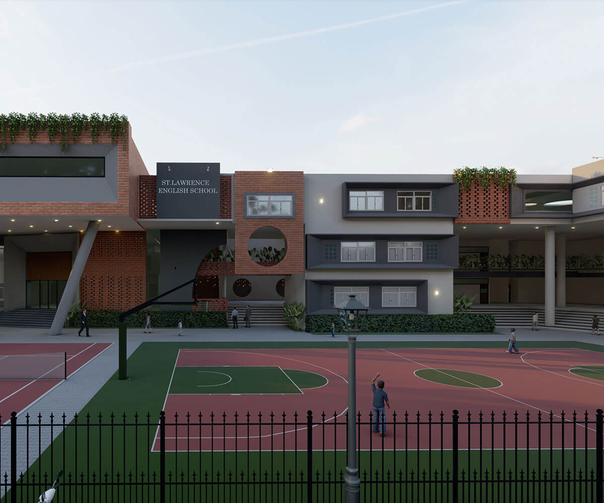 The St. Lawrence School project in Kadabagere , Bengaluru, a substantial institutional development spanning 76,000 sq ft represents a contemporary approach to educational infrastructure. Our design emphasizes a highly functional and engaging campus environment, characterized by a multi-winged building structure that efficiently encloses a central courtyard, optimizing natural light and ventilation within the core academic zones. The architectural aesthetic is modern and clean, incorporating varied facade treatments and strategically integrated green elements on upper levels, signifying a commitment to creating a vibrant and inspiring atmosphere conducive to learning and well-being.